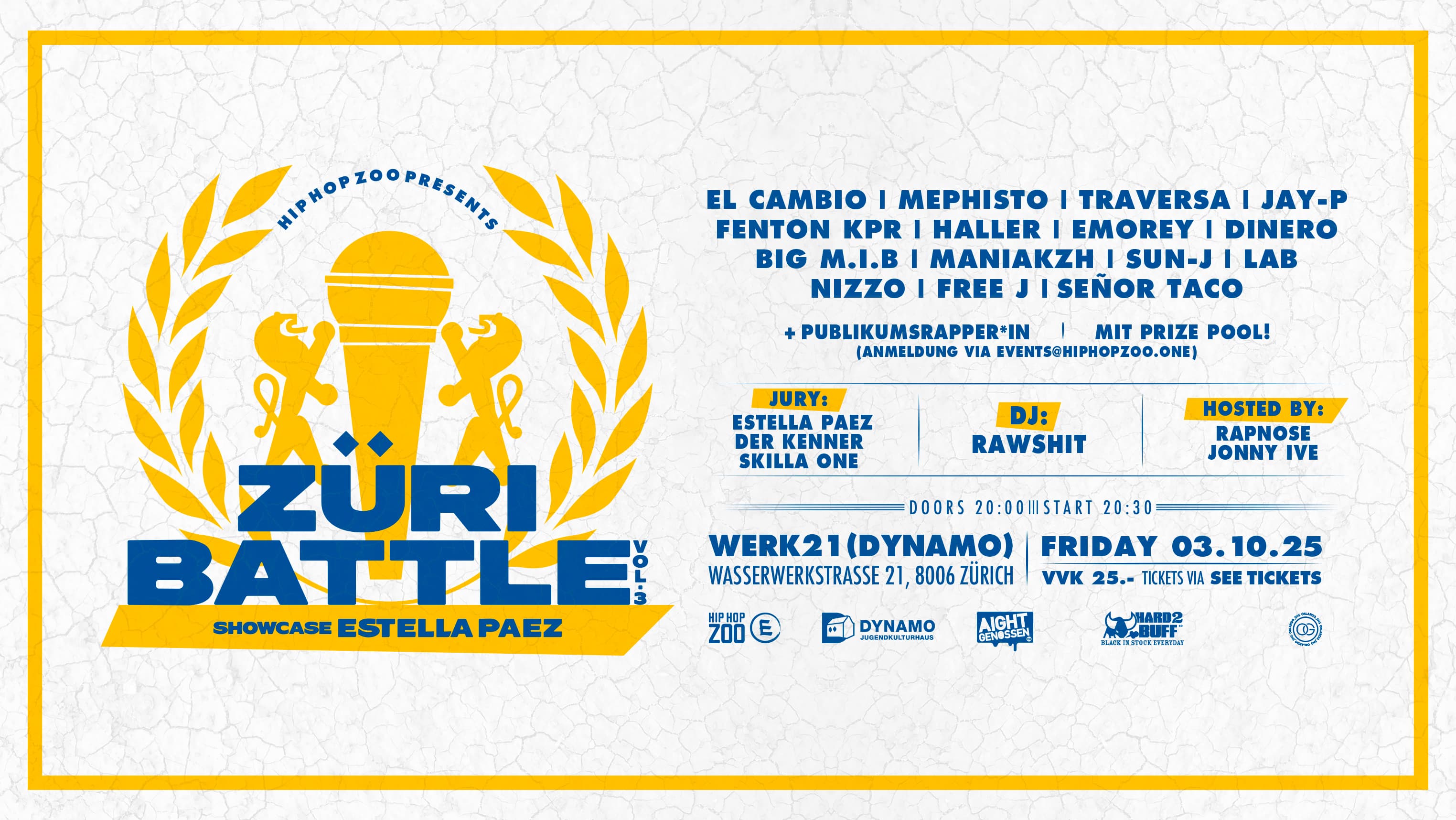 El Cambio / Mephisto / Traversa / Jay-P / Fenton KPR / Haller / Emorey / Dinero / BIG M.I.B. / Maniakzh / Sun-J / LAB / Nizzo / Free J / Senor Taco / + Publikumsrapper*in